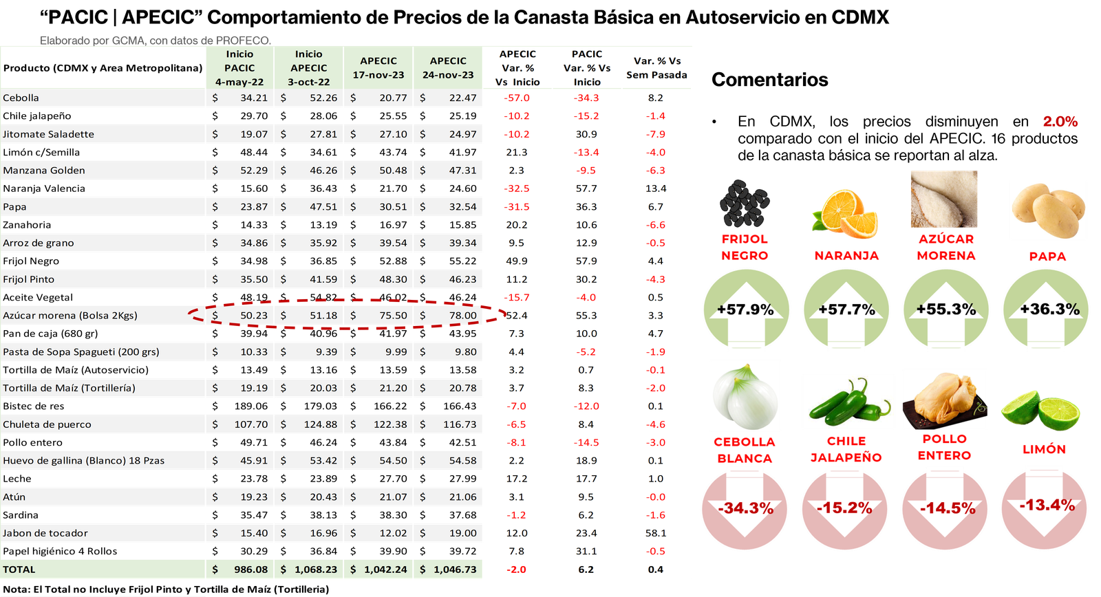 Al 17 de noviembre, el precio de los Artículos de la Canasta Básica «PACIC | APECIC», se comportaron de la siguiente manera:
