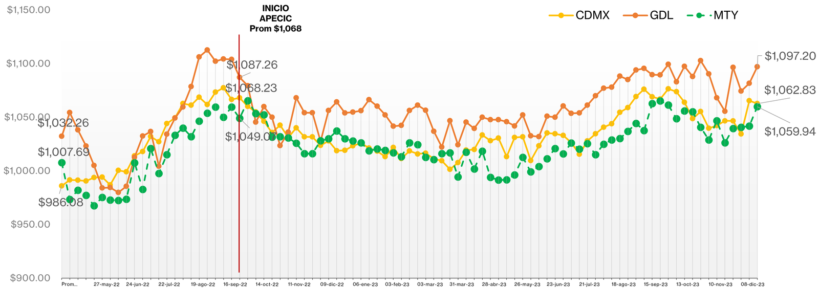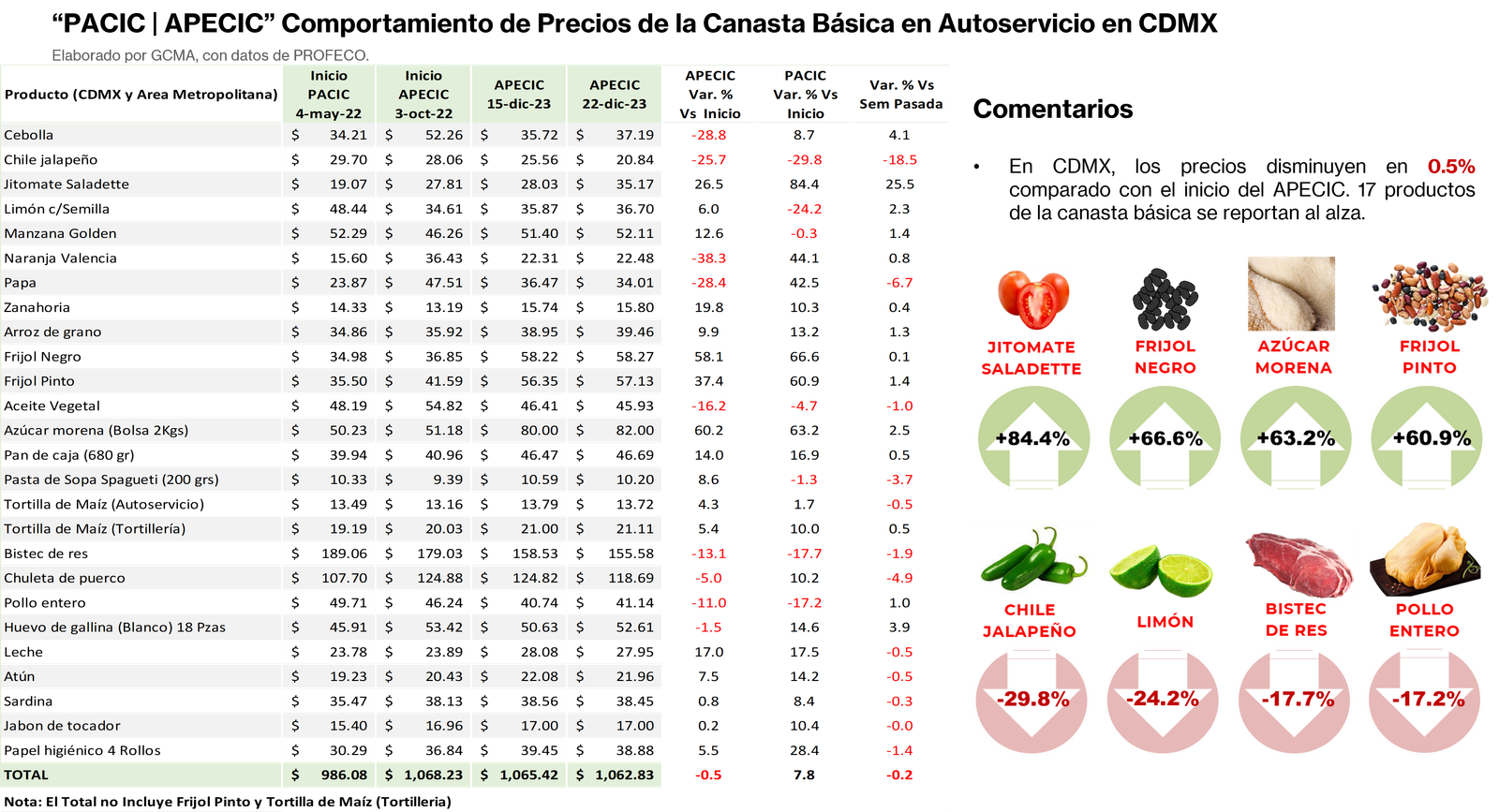 Al 22 de diciembre, el precio de los Artículos de la Canasta Básica «PACIC | APECIC», se comportaron de la siguiente manera: