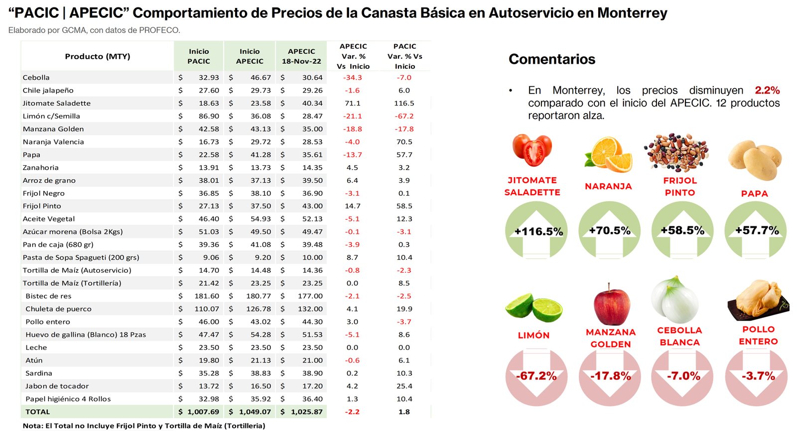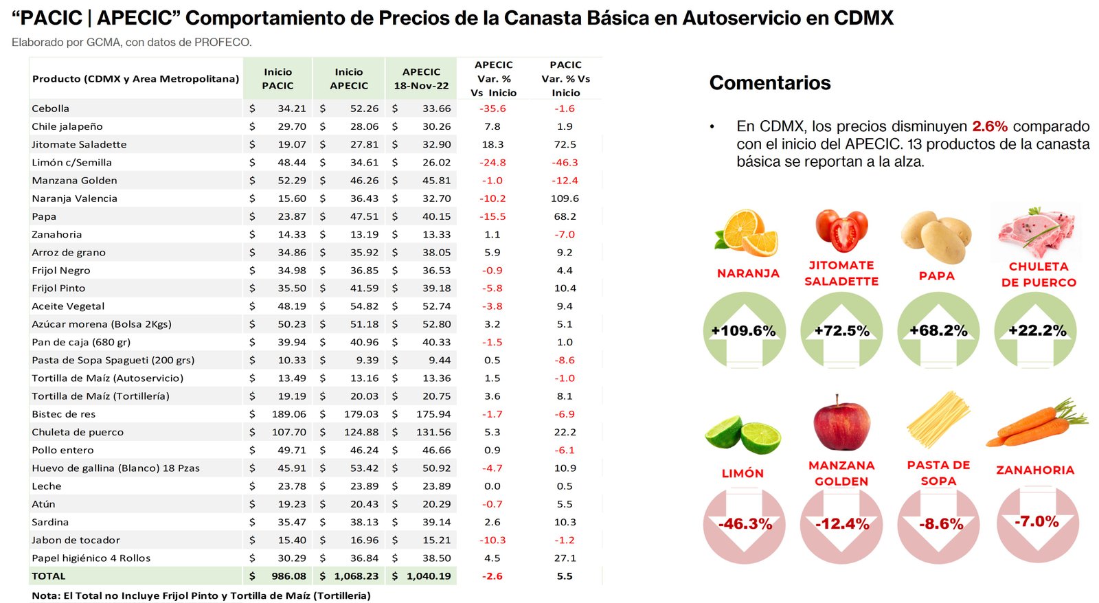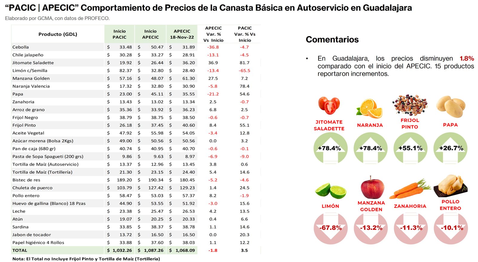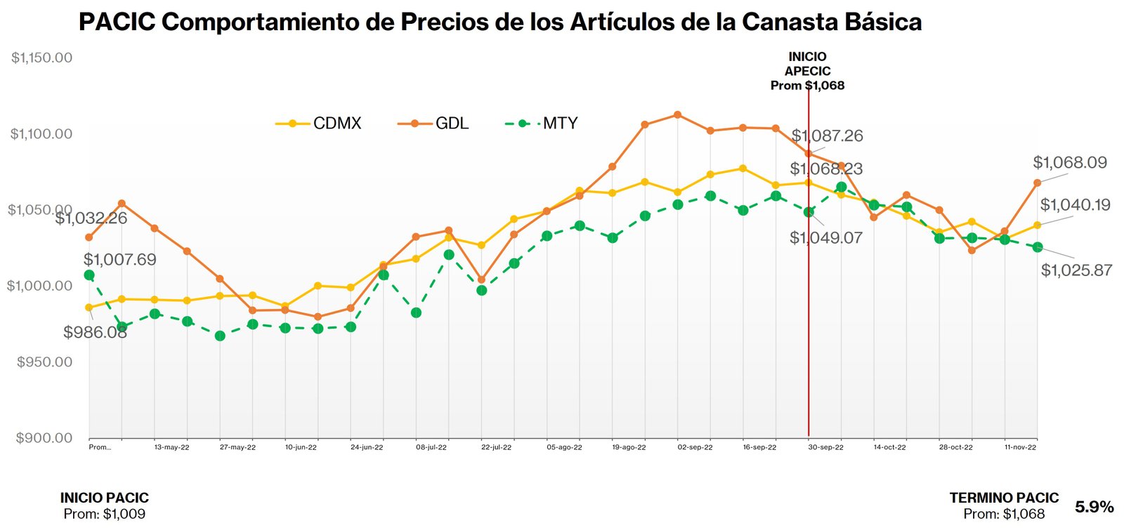 Al 18 de noviembre, la Canasta “PACIC” mantiene incrementos en las tres principales ciudades Guadalajara, CDMX y Monterrey, mientras con «APECIC» muestra nuevos aumentos en las mismas ciudades.