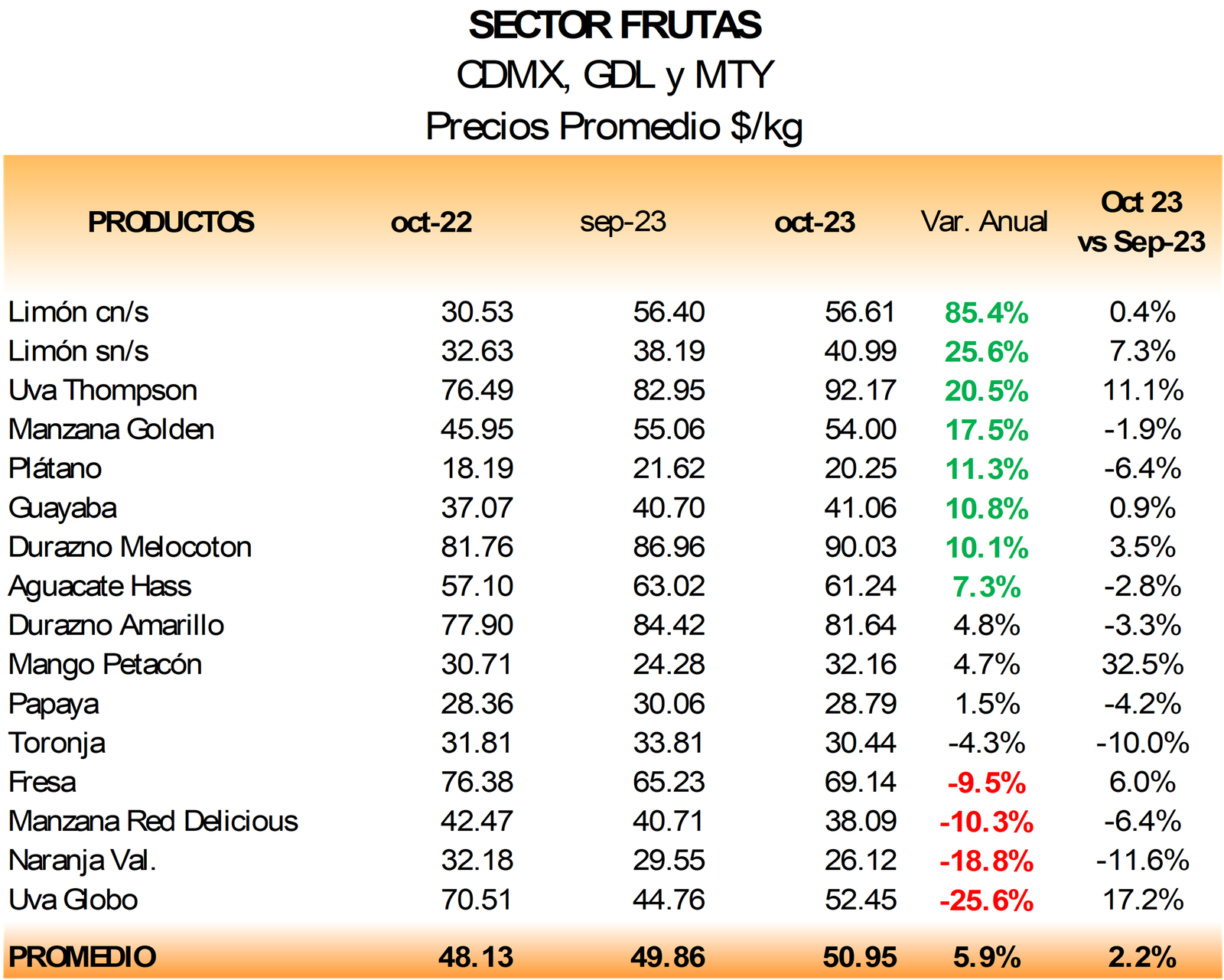 El índice de precios anual de frutas crece 5.9% y mensual se incrementa 2.2%