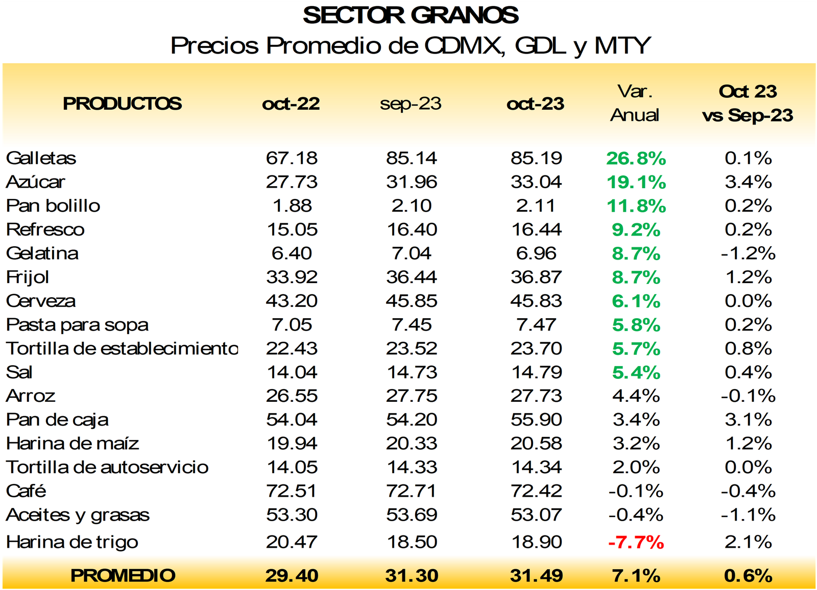El índice de precios de granos y abarrotes sube 7.1% anual y mensual aumenta 0.6%