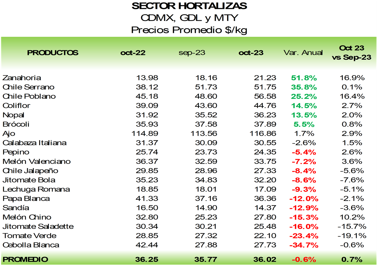 Zanahoria: Durante la mayor parte del mes los envíos que se tuvieron de la producción de Puebla fueron menores a lo estimado pues, por un lado, disminuyó la superficie cultivada y por otro, aumentaron los costos de los insumos agrícolas lo que también influyó en el alza del precio.
