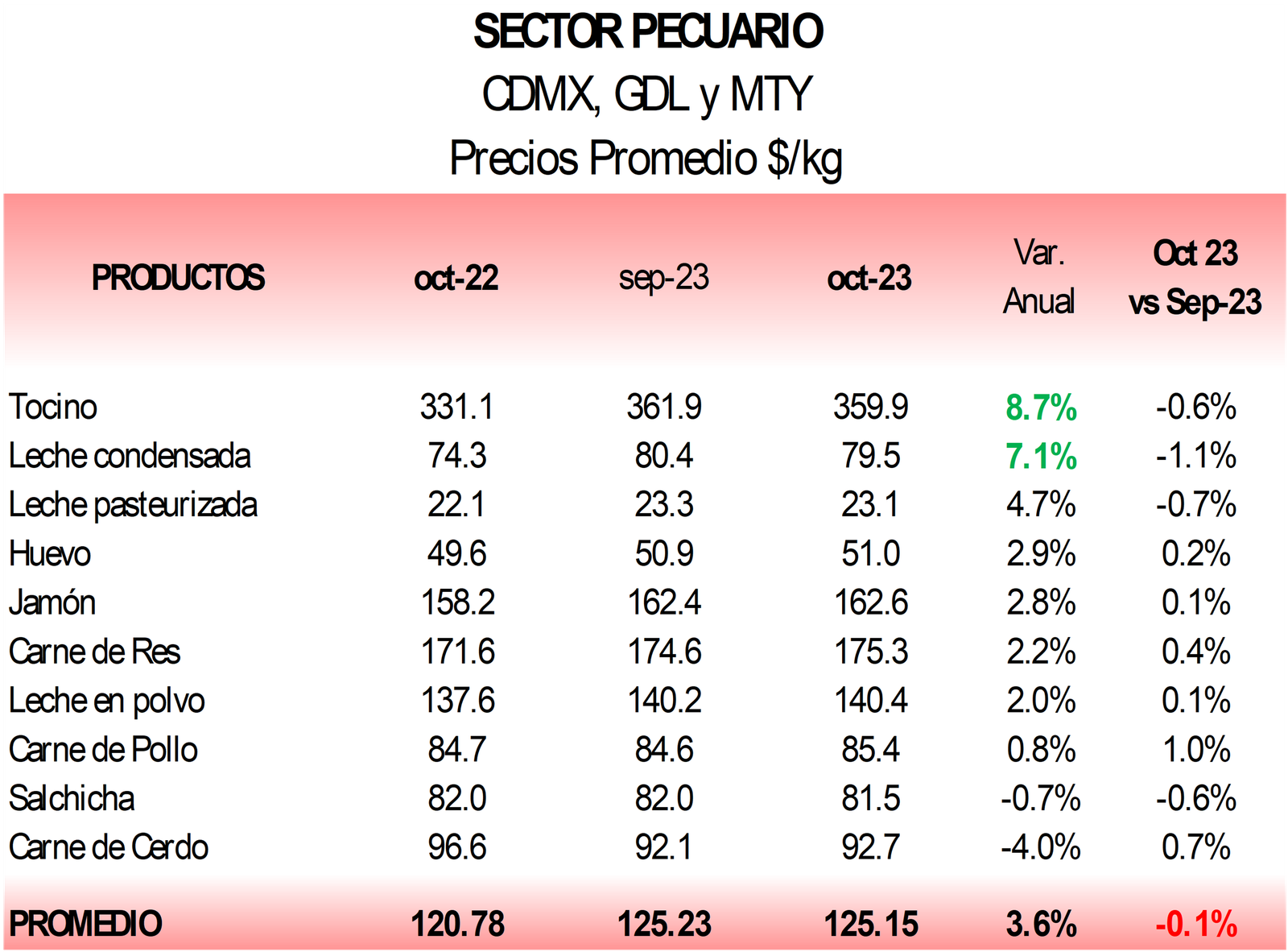 El índice de precios de proteína animal muestra un incremento de 3.6% anual y mensual baja ligeramente 0.1%