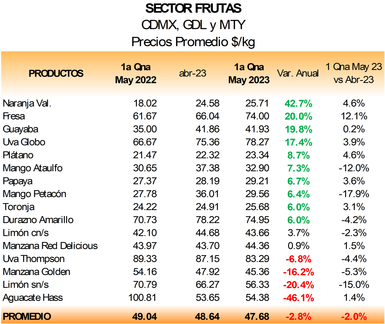 - Naranja: El abasto disminuyó ligeramente una vez que las aportaciones de Veracruz se redujeron porque la recolección entró a la etapa final.