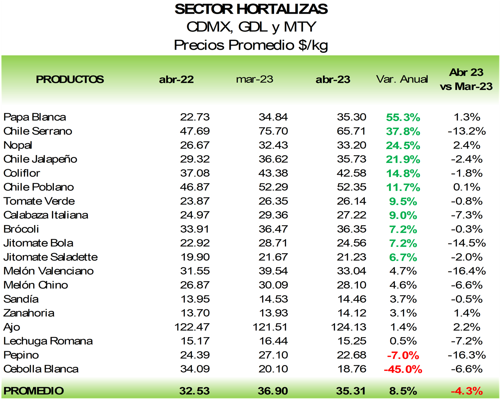 El índice de precios hortícolas muestra un aumento anual de 8.5% y mensual disminuye 4.3%