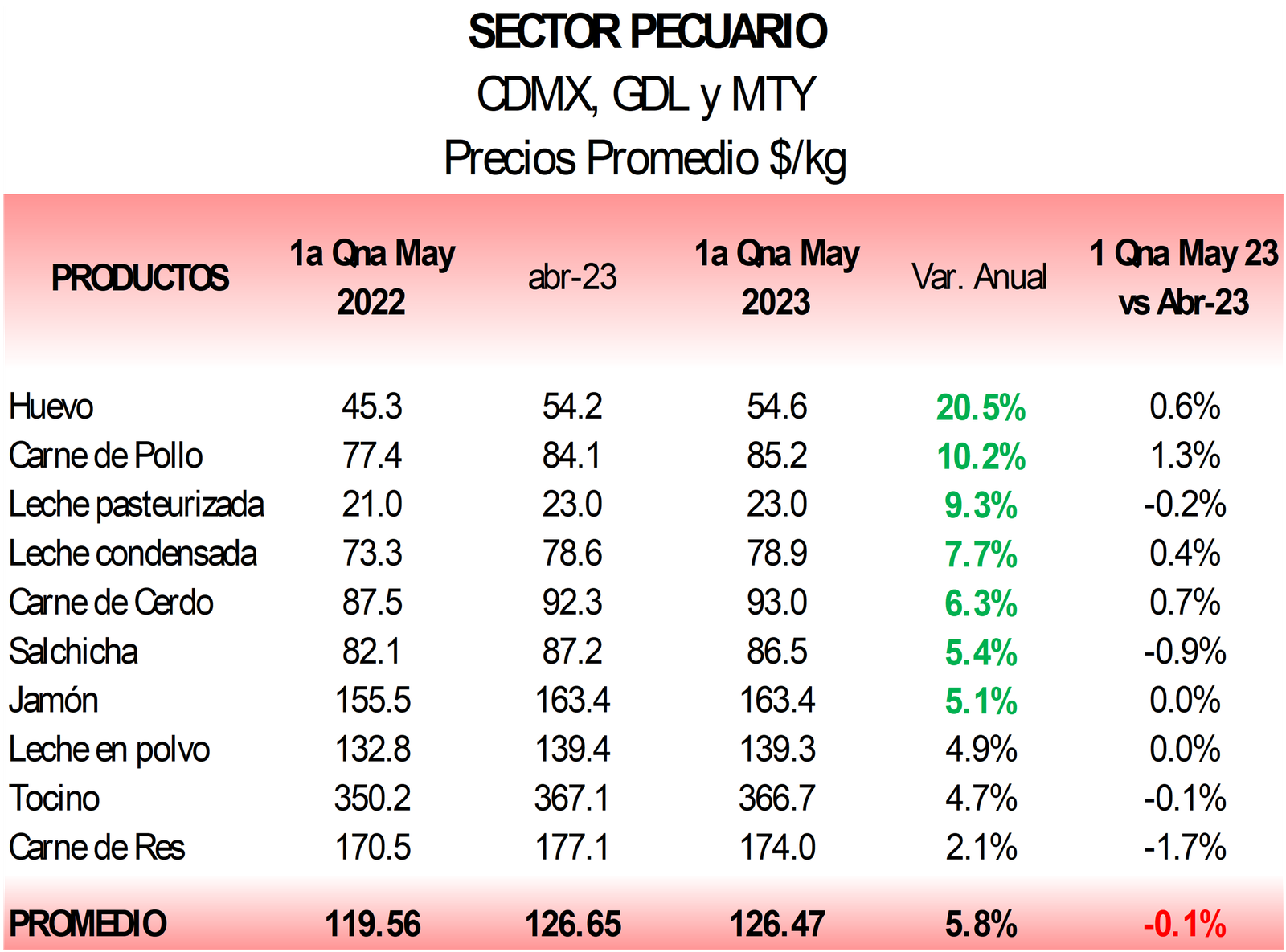 El índice de precios de proteína animal refleja un aumento anual de 5.8%