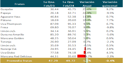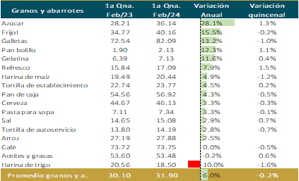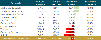 Los principales grupos de alimentos tuvieron una variación anual de: Pecuario ↓2.3%; Granos y abarrotes ↑6%; Frutas ↑14.9%; Hortalizas ↑18.1%.
