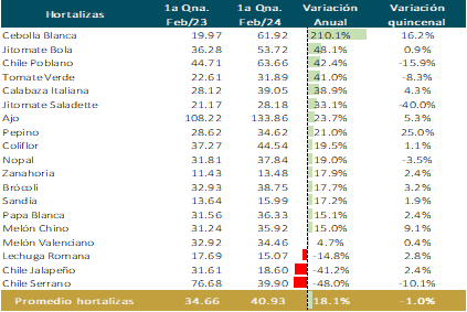 • ↑210.1% Cebolla: Producto de alta demanda sostenida, productores han reportado altos costos en los insumos.