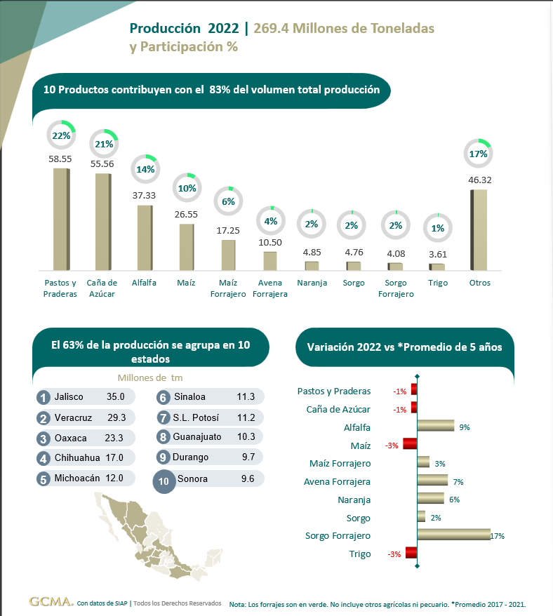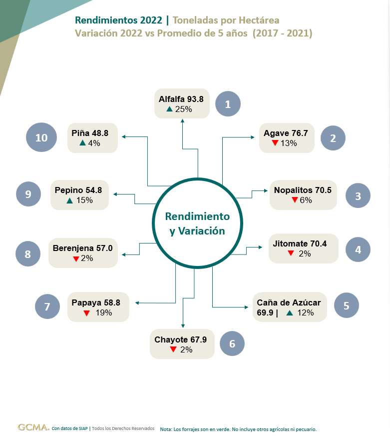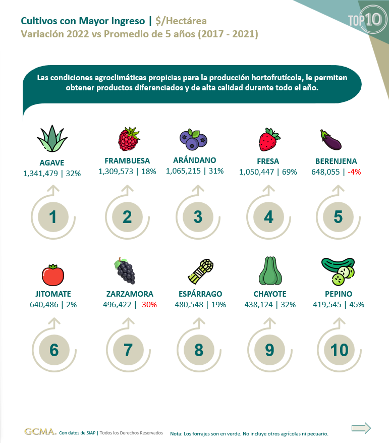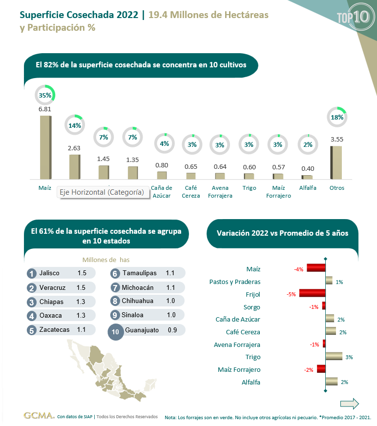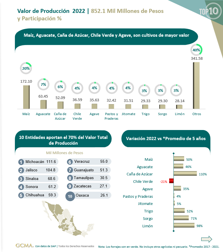De acuerdo con la información publicada por el Servicio de Información Agroalimentaria y Pesquera (SIAP), Grupo Consultor de Mercados Agrícolas (GCMA) ha elaborado esta tercera edición, con el objetivo de presentar los diez cultivos más importantes del sector agrícola durante 2022.
