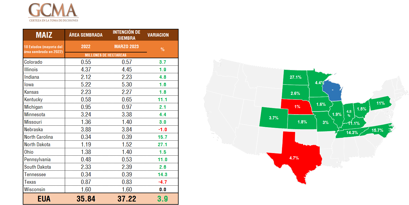 El 31 de marzo, el USDA reportó la intención de siembra de maíz para este año en 37.22 millones de hectáreas, una cifra ligeramente bajista, ya que esta por arriba de lo esperando por el mercado, de la superficie prevista en febrero y del área sembrada en el año pasado. El mercado esperaba 36.78 millones de ha, la superficie prevista en el Foro del USDA en febrero fue de 36.83 millones y el área sembrada el año pasado de 35.84 millones de hectáreas.