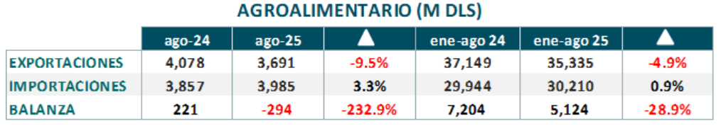 En agosto de 2025 el valor de las exportaciones agroalimentarias fue de 3,691 millones de dólares, 9.5% menor al reportado en igual periodo de 2024. El valor de las importaciones alcanzó 3,985 millones de dólares, 3.3% más al comparado con el mismo mes de 2024. Reflejando un déficit de 294 millones de dólares en la balanza comercial.