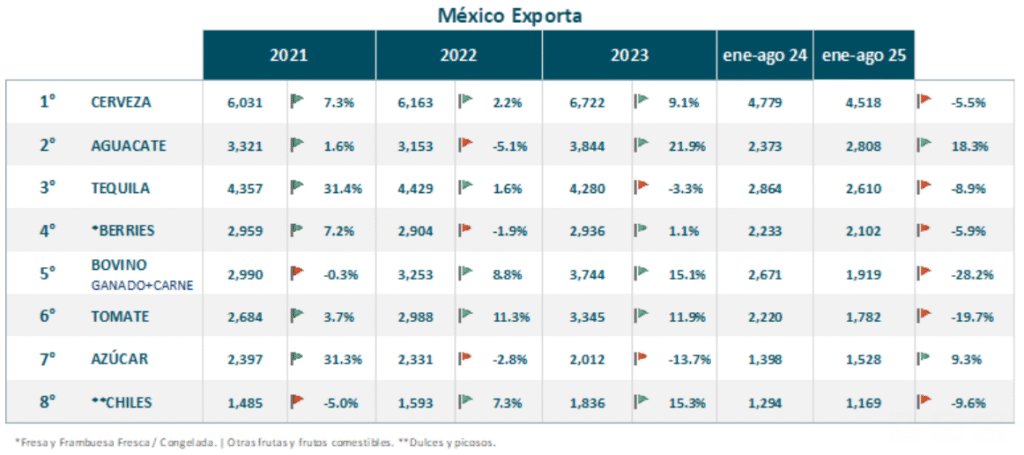 PRINCIPALES EXPORTACIONES AGROALIMENTARIAS DE MÉXICO ENE-AGO 2025 VS ENE-AGO 2024: