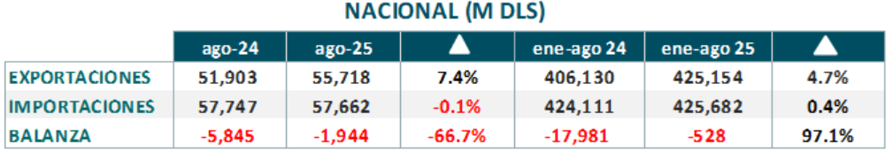 En el acumulado a agosto, el valor de las exportaciones llegó a los 425,154 millones de dólares, con un incremento del 4.7%, respecto del mismo periodo de 2024. El valor de las importaciones en el periodo de referencia alcanzó los 425,682 millones de dólares, reflejando un ligero aumento de 0.4%. Registrando un déficit en la balanza comercial por 528 millones de dólares.