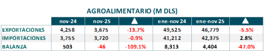 En noviembre de 2025 el valor de las exportaciones agroalimentarias fue de 3,675 millones de dólares, 13.7% menor al reportado en igual periodo de 2024. El valor de las importaciones alcanzó 3,720 millones de dólares, 0.9% menos al comparado con el mismo mes de 2024. Reflejando un déficit de 46 millones de dólares en la balanza comercial.