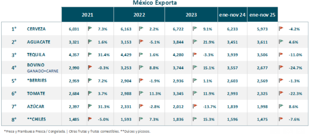 PRINCIPALES EXPORTACIONES AGROALIMENTARIAS DE MÉXICO ENE-NOV 2025 VS ENE-NOV 2024: