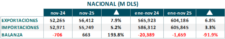 En el acumulado a noviembre, el valor de las exportaciones llegó a los 604,186 millones de dólares, con un incremento del 6.8%, respecto del mismo periodo de 2024. El valor de las importaciones en el periodo de referencia alcanzó los 605,845 millones de dólares, reflejando un aumento de 3.3%. Registrando un déficit en la balanza comercial por 1,659 millones de dólares.