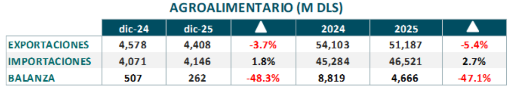 En diciembre de 2025 el valor de las exportaciones agroalimentarias fue de 4,408 millones de dólares, 3.7% menor al reportado en igual periodo de 2024. El valor de las importaciones alcanzó 4,146 millones de dólares, 1.8% mayor al comparado con el mismo mes de 2024. Reflejando un superávit de 262 millones de dólares en la balanza comercial.