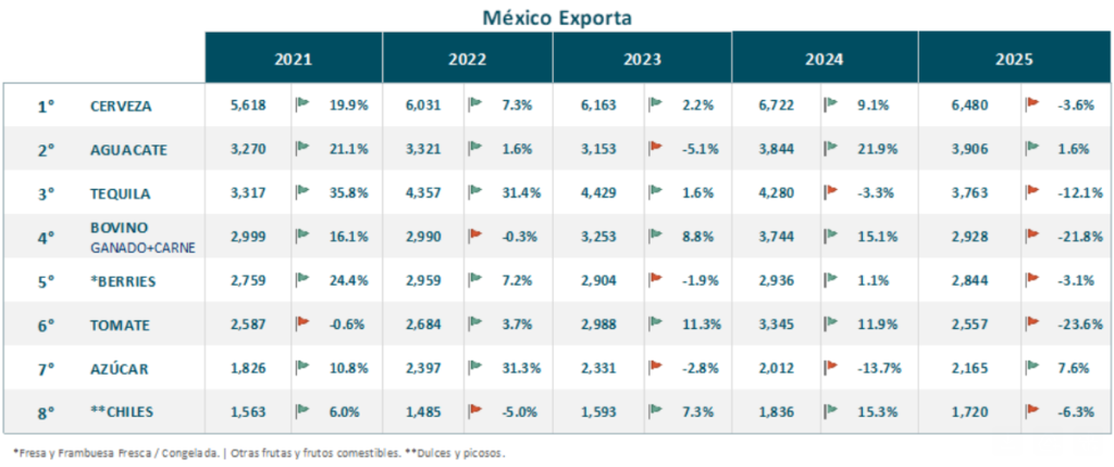 PRINCIPALES EXPORTACIONES AGROALIMENTARIAS DE MÉXICO 2025 VS 2024: