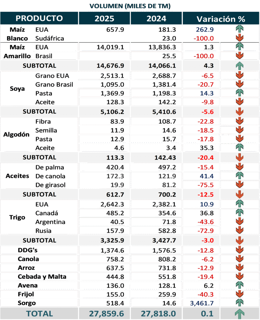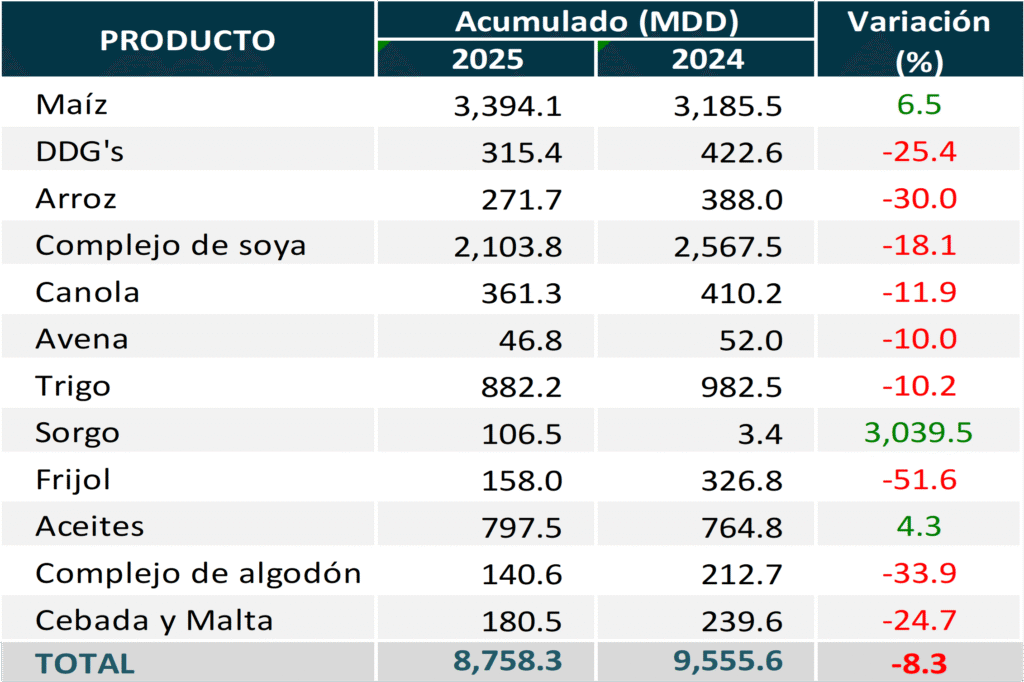 - El volumen de importación de granos y oleaginosas durante siete meses del año registró un ligero crecimiento de 0.1%, al ubicarse en 27.9 millones de toneladas. Por lo contrario, el valor de las importaciones disminuyó 8.3%, alcanzando un total de 8,758.3 millones de dólares.