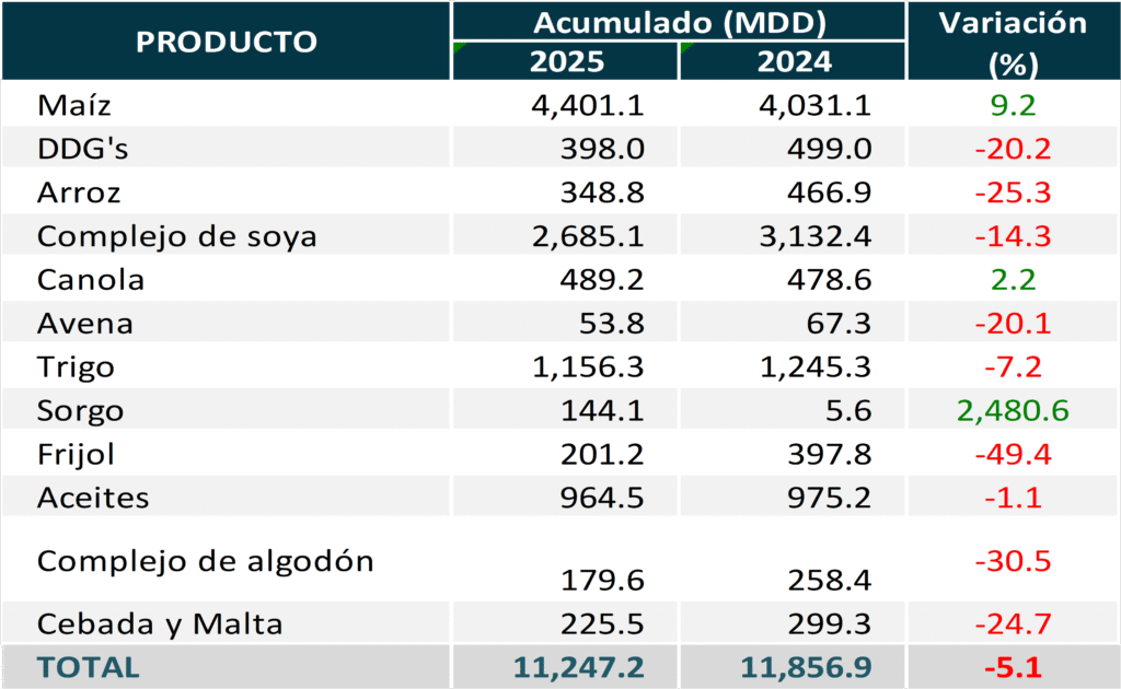 - El volumen acumulado de importación de granos y oleaginosas al tercer trimestre registró un crecimiento de 3.1%, al ubicarse en 36.43 millones de toneladas. Por lo contrario, el valor de las importaciones disminuyó 5.1%, alcanzando un total de 11,247.2 millones de dólares.