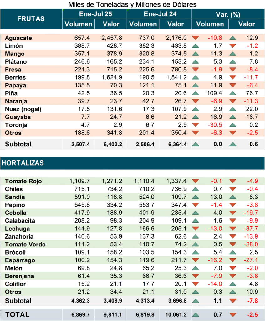 LAS EXPORTACIONES HORTOFRUTÍCOLAS DE ENERO – JULIO DE 2025 VS 2024, INCREMENTAN EN VOLUMEN 0.7%; NO OBSTANTE, EN TÉRMINOS DE VALOR DECRECEN EN 2.5%.