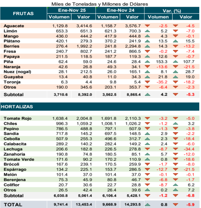 • Destacan aumentos en volumen de Piña (+153%), Guayaba (+21.8%), Berries (+14.3%), Plátano (+13.5%) y Papaya (+12.6%).