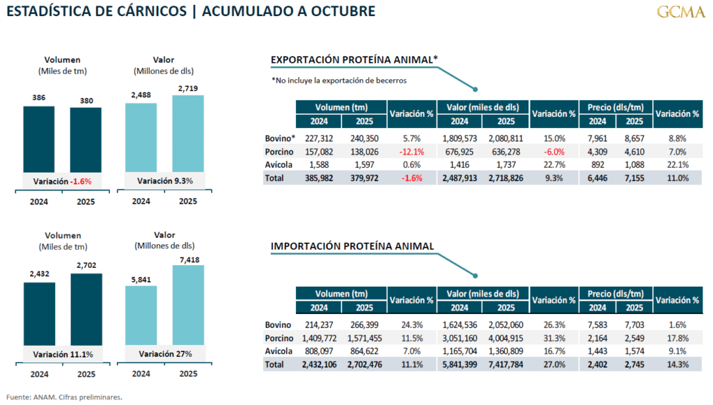 - Importaciones totales de carne: Aumentaron 11.1% en volumen y 27% en valor.