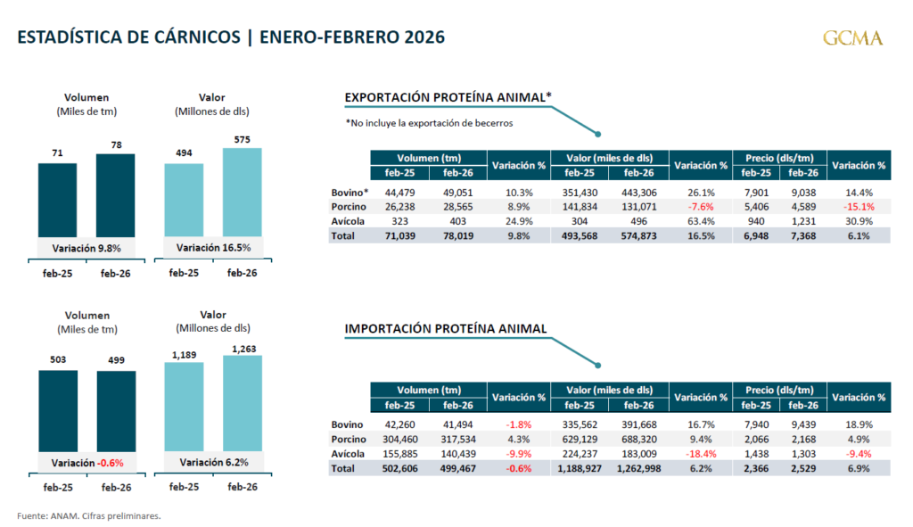 • Las exportaciones de proteína animal crecen en volumen (+9.8%) y valor (+16.5%), impulsadas por mejores precios internacionales.
