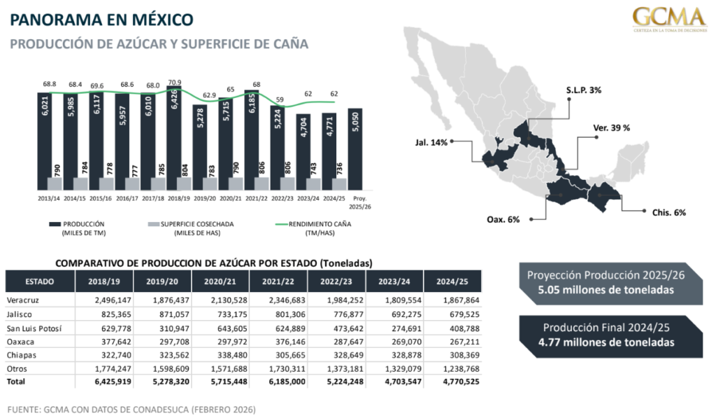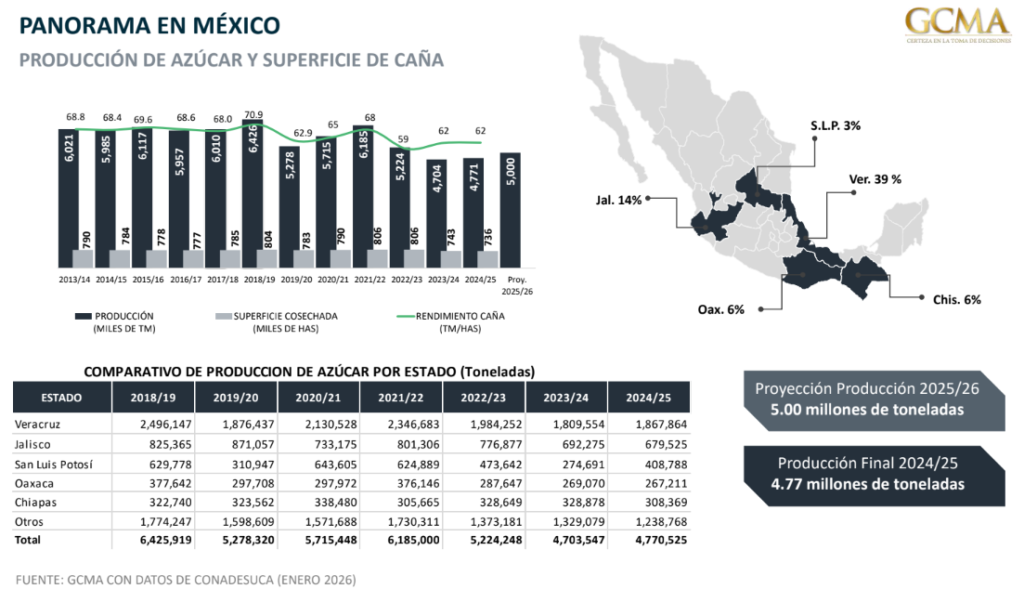 - Producción 2025/26 ajustada a 5.0 millones de toneladas, por retrasos operativos en la zafra.