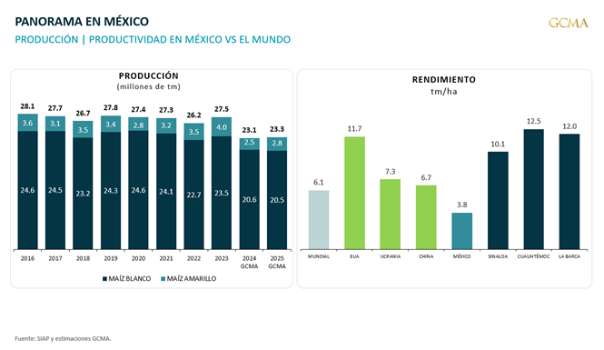 - Importaciones al alza: México importó 16.7 MTM de maíz (+3.9% anual); el maíz blanco repuntó 267.7%, mientras que el amarillo apenas creció 0.5%.