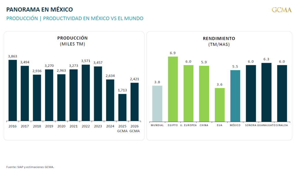 - Producción: Estimado GCMA para 2026 en 2.4 MT, con fuerte caída en ciclo O-I por impactos sanitarios (roya) y falta de horas frío, especialmente en Sonora y Sinaloa.