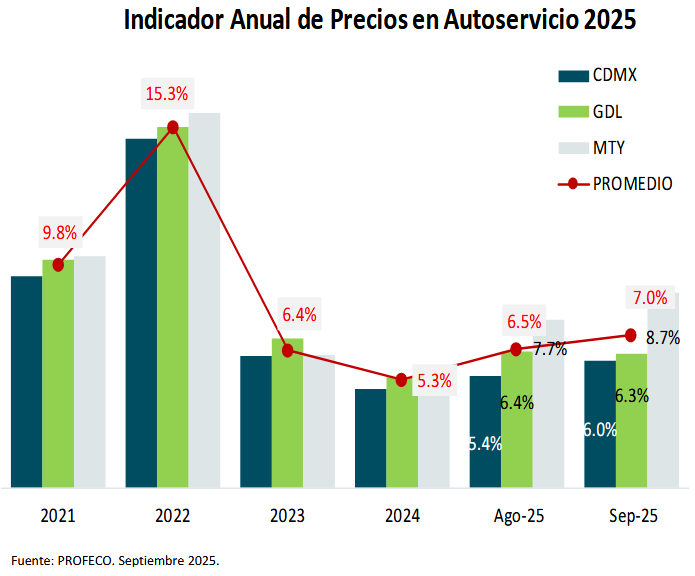 - Los precios de la canasta básica se incrementan 7.0% al mes de septiembre contra 6.5 de agosto 2025.