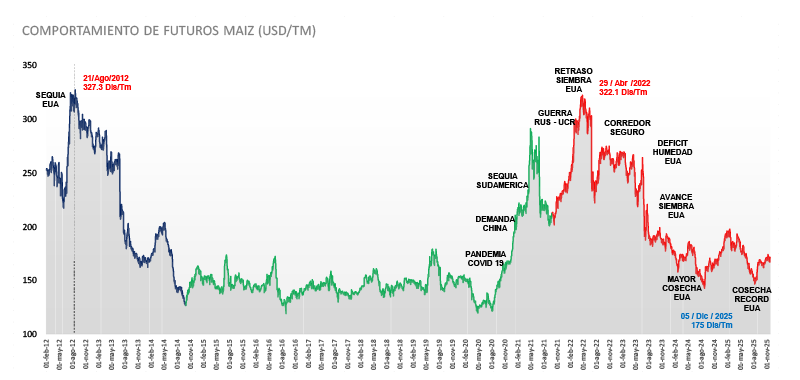Comportamiento del precio futuro de Maíz al 05 de diciembre de 2025 (175 USD/TM).