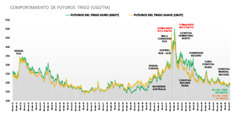 Comportamiento del precio futuro de Trigo duro (KBOT) al 05 de diciembre de 2025: 195 USD/TM.