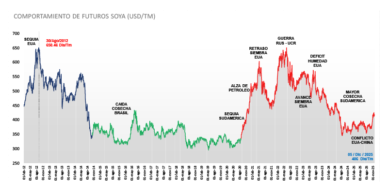 Comportamiento del precio futuro de Soya al 05 de diciembre de 2025: 406 USD/TM. (USD/TM).