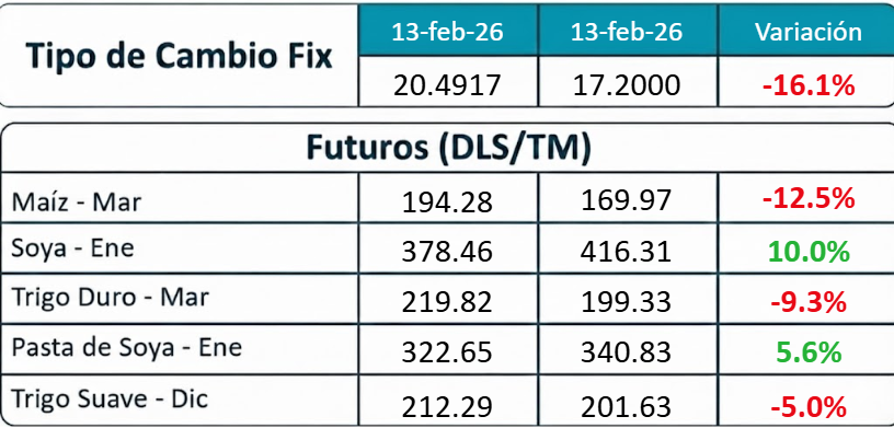 Comparativo del precio futuro de Soya al 13 de febrero de 2026 (416 USD/TM).