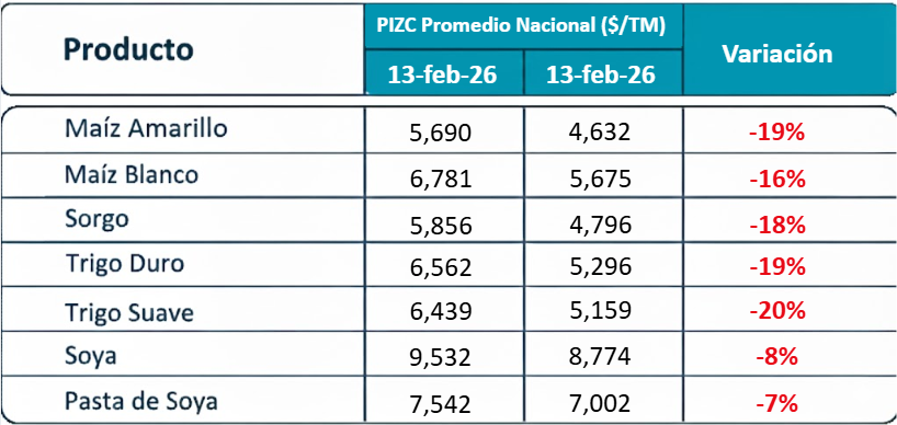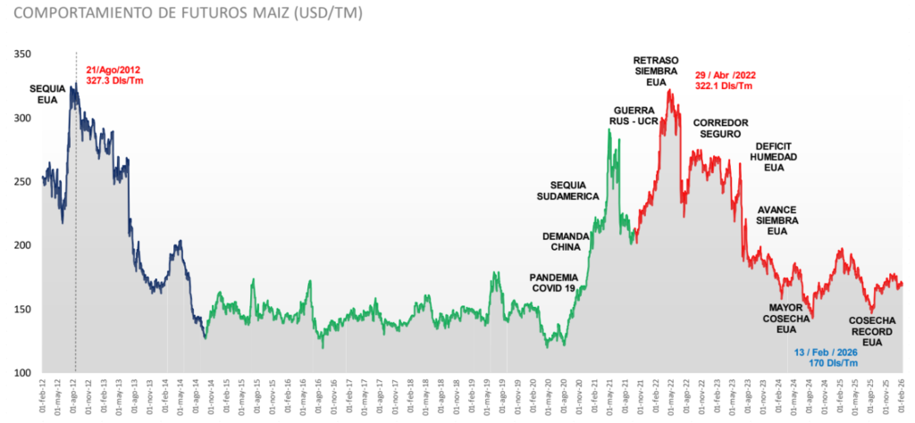 Comparativo del precio futuro de Maíz al 13 de febrero de 2026 (170 USD/TM).