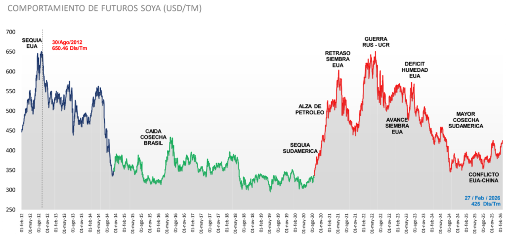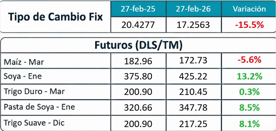 Comparativo del precio futuro de Soya al 27 de febrero de 2026 (425 USD/TM).