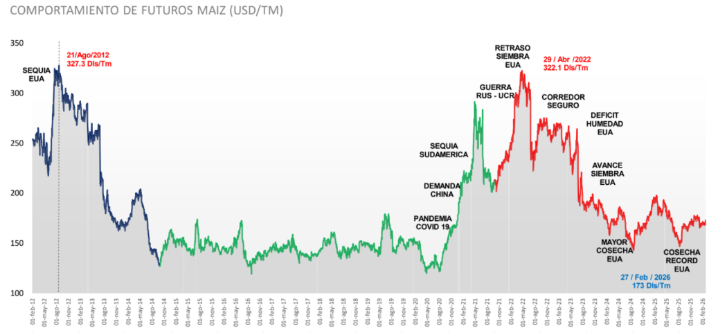 Comparativo del precio futuro de Maíz al 27 de febrero de 2026 (173 USD/TM).