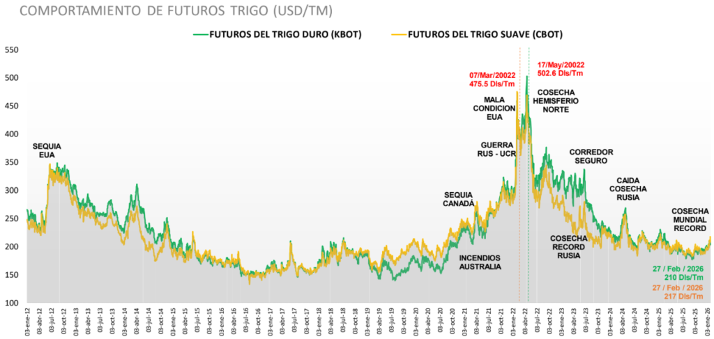 Comparativo del precio futuro de Trigo Duro al 27 de febrero de 2026 (210 USD/TM).