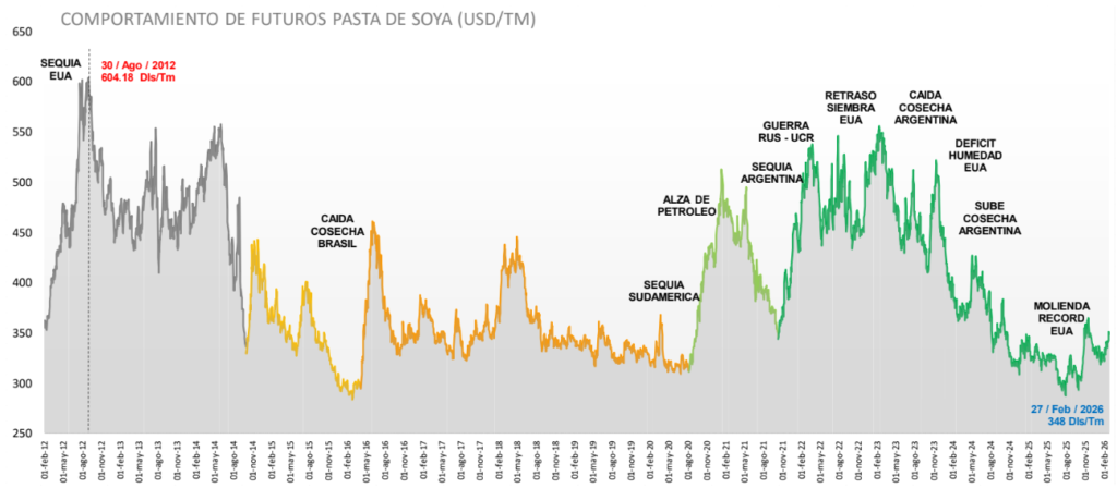 Comparativo del precio futuro de Pasta de Soya al 27 de febrero de 2026 (348 USD/TM).