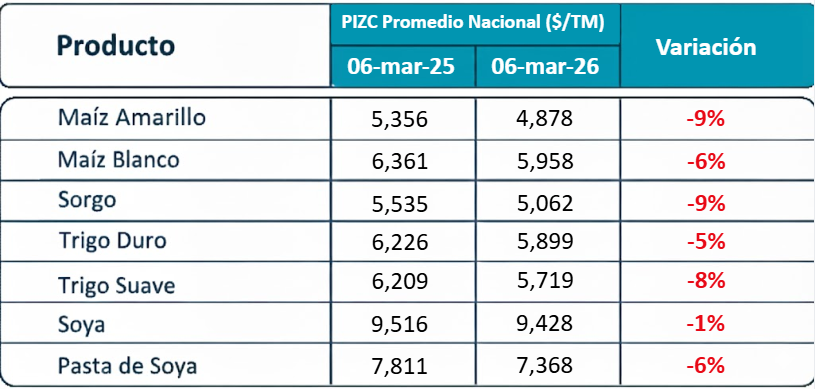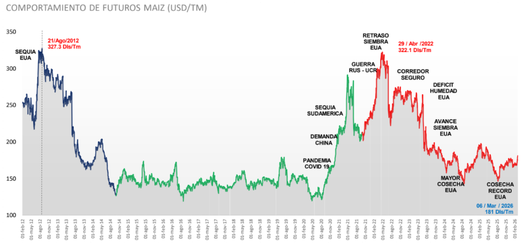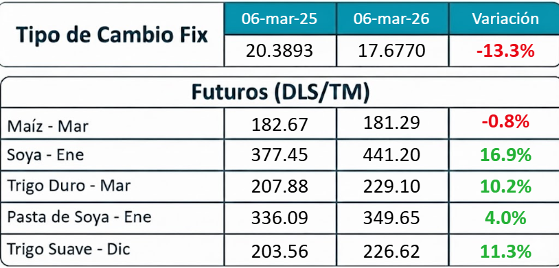 Comparativo del precio futuro de Maíz al 6 de marzo de 2026 (181 USD/TM).