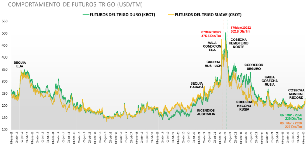 Comparativo del precio futuro de Trigo Duro al 6 de marzo de 2026 (229 USD/TM).