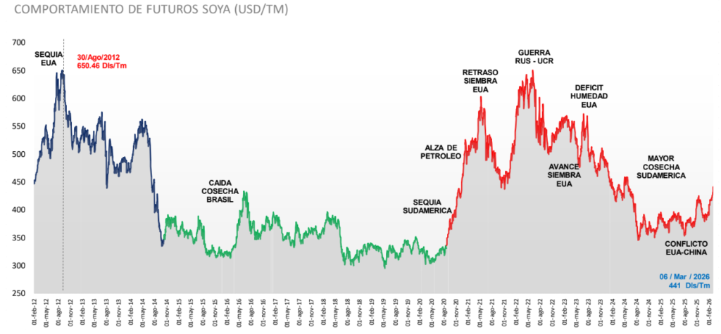 Comparativo del precio futuro de Soya al 6 de marzo de 2026 (441 USD/TM).