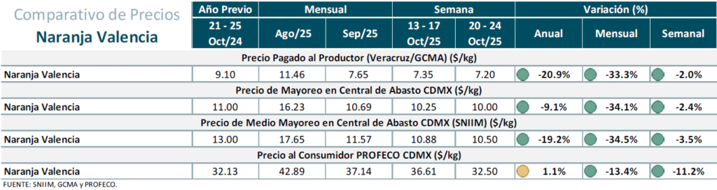 Precios de la Naranja Valencia: precio al productor, mayoreo y al consumidor.