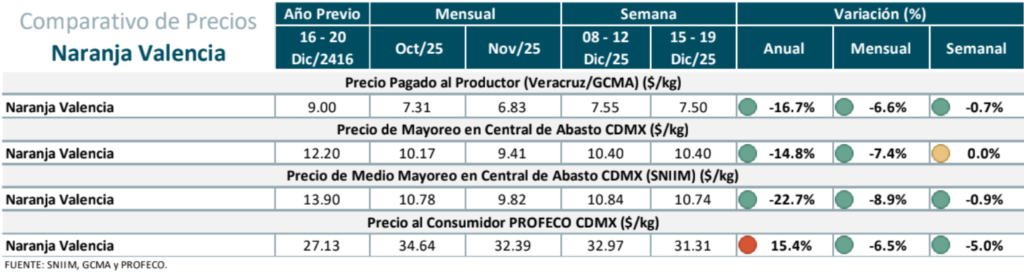 • El precio de la naranja de reciente ingreso al consumo en fresco se estabilizó esta semana. La oferta fue suficiente para cubrir la demanda, con envíos constantes desde Veracruz y Tamaulipas ante la consolidación del corte. Con abastecimiento regular y disponibilidad en mercados mayoristas y bodegas, se prevé que la cotización se mantenga cercana a los niveles actuales, con ajustes a la baja para el consumidor.