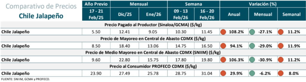 Precios del Chile Jalapeño: precio al productor, mayoreo y al consumidor.