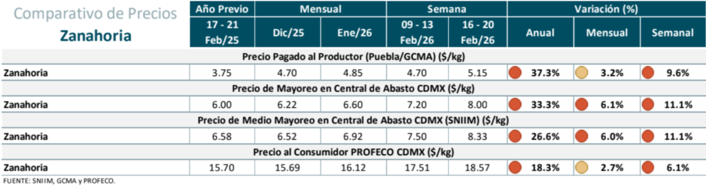 Precios de la Zanahoria: precio al productor, mayoreo y al consumidor.
