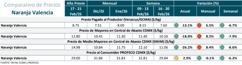 Precios de la Naranja: precio al productor, mayoreo y al consumidor.