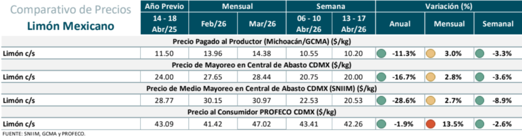 Precios del Limón Mexicano: precio al productor, mayoreo y al consumidor.